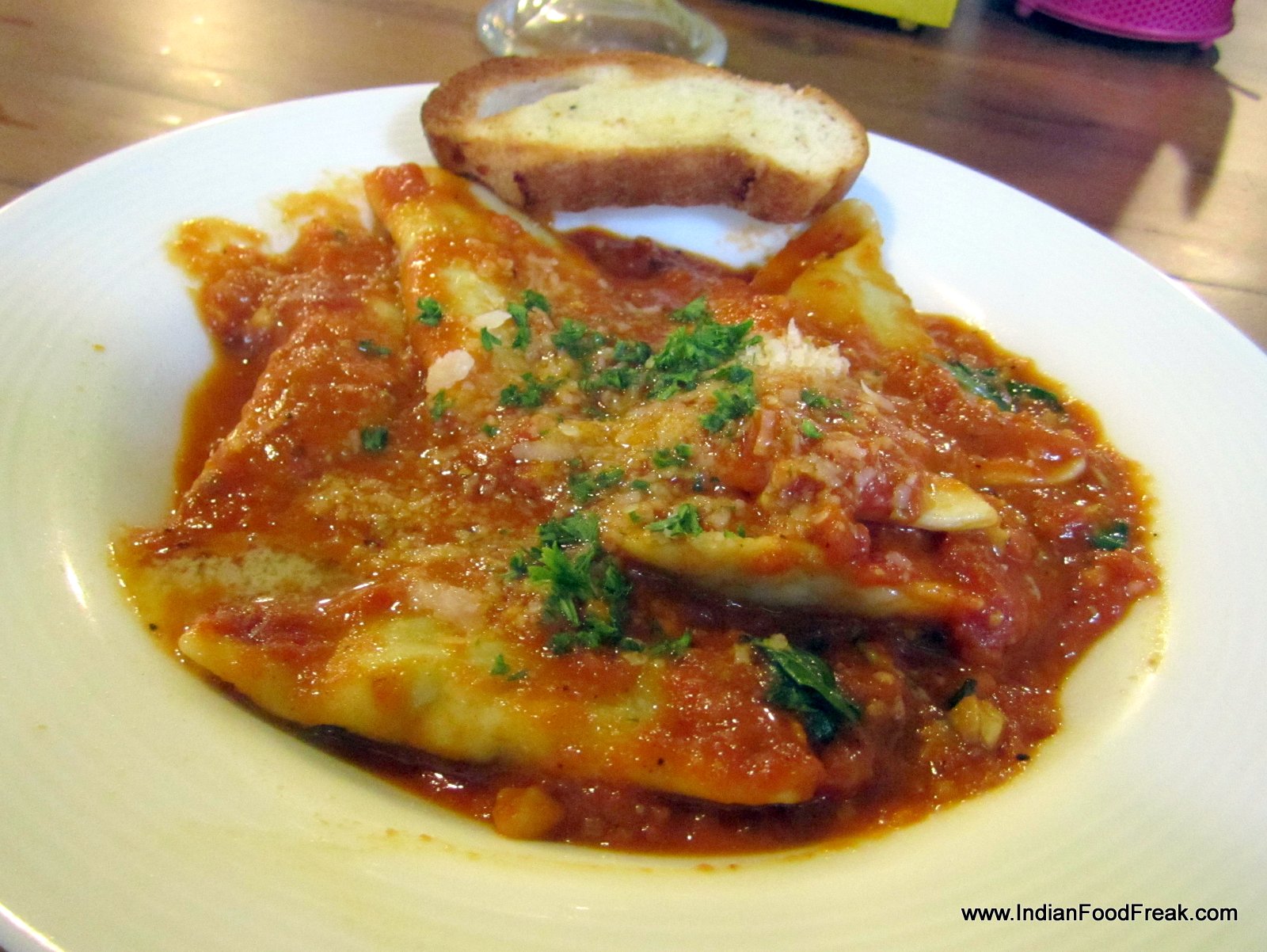 From the mains, I decide to try a perfectly cooked pan seared fresh sole fish (Rs425) with a tangy lime, green beans, fennel, almond and citrus orange salad as able accompaniments. The vegetarian ravioli filled with spinach, broccoli & ricotta cheese blend (Rs 325) served in the classic arrabiata sauce is handmade and delicious. I end the meal with cool, creamy and fruity frozen blueberry yoghurt (Rs 75), a nice end to a good meal.