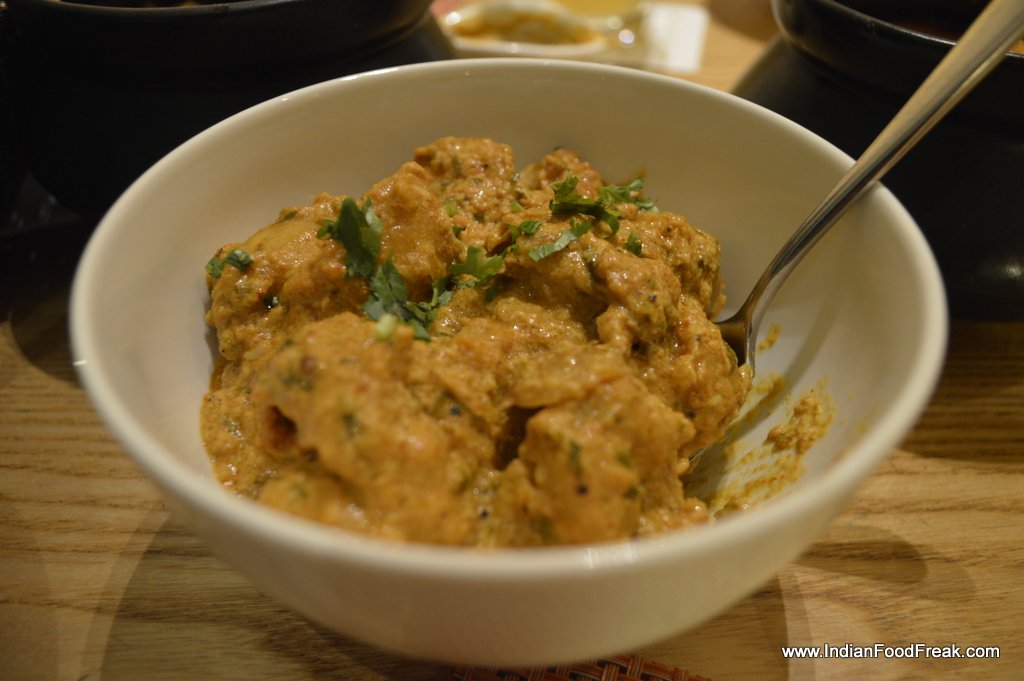 Papad with chutneysMy friend and I commenced the culinary proceedings with Rose Sharbat which was fresh and absolutely refreshing (it took me back to my childhood when we would sneak and collect rose petals from all the gardens in my colony and mom would make us some sharbat). Papad was then served with beetroot, tomato and pineapple chutneys which were interesting and yummy followed by Murg Badaam ka Shorba which is a must try – it is slow cooked with bones and finished subtlely with almond paste.