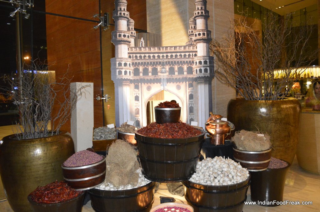 The right ambience has been attempted to be created – a big cut out of the Charminar at the entrance, huge earthenware pots full of spices as decoration, a hostess dressed to the occasion in shararas with maangtika and the works, etc.