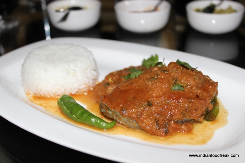 The Grilled whole pomfret that followed was rubbed with Andhra spices and grilled to perfection to give it a juicy and flaky texture while retaining the spiciness of the dry rub. The fish was served with three unique chutneys, one of them made with ginger, chillies and jaggery was gingery pungent with a sweet aftertaste. The second one a onion, tomato and chilli chutney was a slightly spicier version of the Mexican salsa and paired well with the fish. The last chutney was a Coconut and curry leaves mix which was a salty paste which I didn’t really care for much.