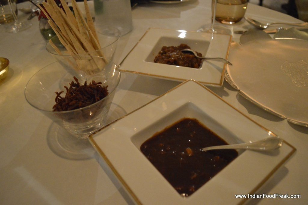 Without much delay, we are served crispy shredded mutton along with two brilliant chutneys; peanut-eggplant, and tamarind-dates. This crispy shredded mutton is something similar to aloo-bhujiya but much-much difficult to make. Kunal says that since this involves a lot of manual efforts by first boiling the meat and separating shreds of fiber by hand before frying them, at times it is given to the person turning late in the kitchen as a punishment 🙂