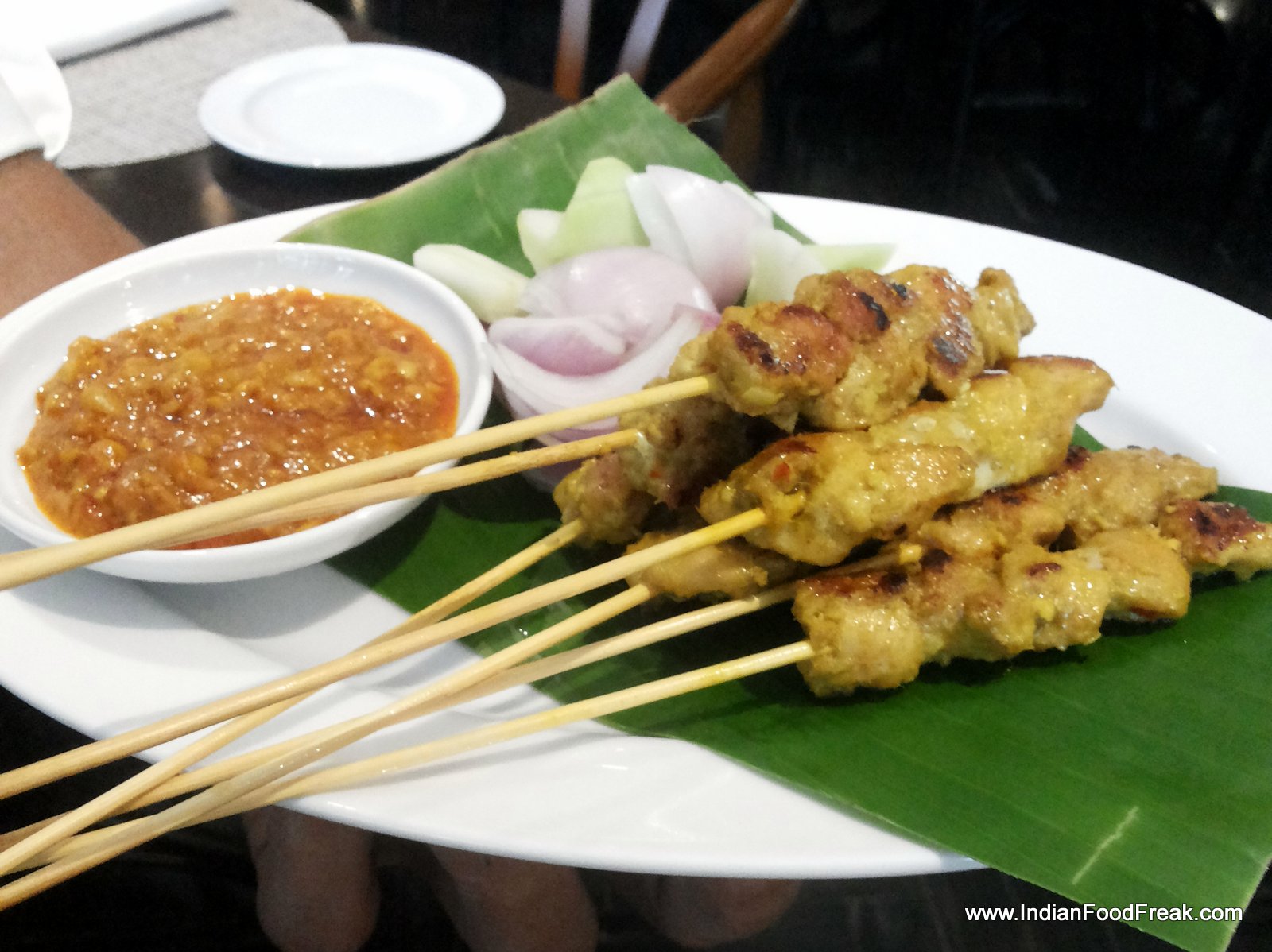 I started with the Vegetables Rolled in Rice Paper and shot glass shaped Canapés with Veg. Stuffing which were difficult to eat as they were crumbling with each bite and becoming a messy affair. These were followed by the soft Chicken and Mutton Satay with freshly made peanut sauce which were very well made and charred to perfection. The starters were downed by me to the accompaniment of an excellent Singapore Sling, a gin based cocktail invented in and made famous by the Raffles Hotel in Singapore.