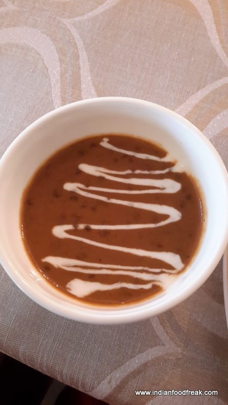 The Dal Shorba was served with 2-3 pieces of jeera aloo, a piece of pickled onion, some mustard oil and rolled namakparas already placed in the soup bowl with the soup poured from a kettle.The soup was yellow lentil with mustard and curry leaf, finished with coconut milk.