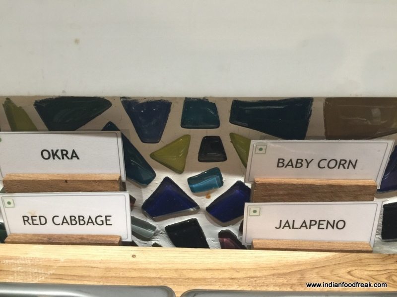 First glance at the ceiling and I liked the colourful wok-clad look. Rather spacious and leading to an open area which one can into through a door, it gave a clean uncluttered look. A community table to seat about 16 people was placed in the centre. And there were smaller tables all around – looked neat and contemporary. What caught my attention was that most of the tables were occupied. A glass partition allowed a viewing of rapid action at the woks; made a mental note to try out a wok for the mains.
