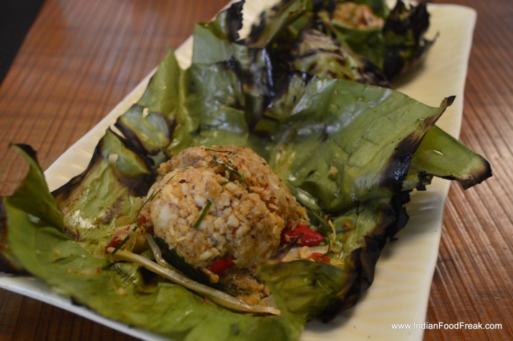 Being a huge fan of Thai cuisine I couldn’t have asked for more. I have often eaten fish steamed in banana leaves (an age old technique of cooking) but it was the first time that I had Grilled Prawn Parcels. Two prawns with grated coconut on a bed of cabbage, basil and red eye chili were done to perfection. It is very easy to overcook prawns and especially when they are wrapped inside a banana leaf. But these were soft and juicy, sweet from the coconut and spicy from the chili.