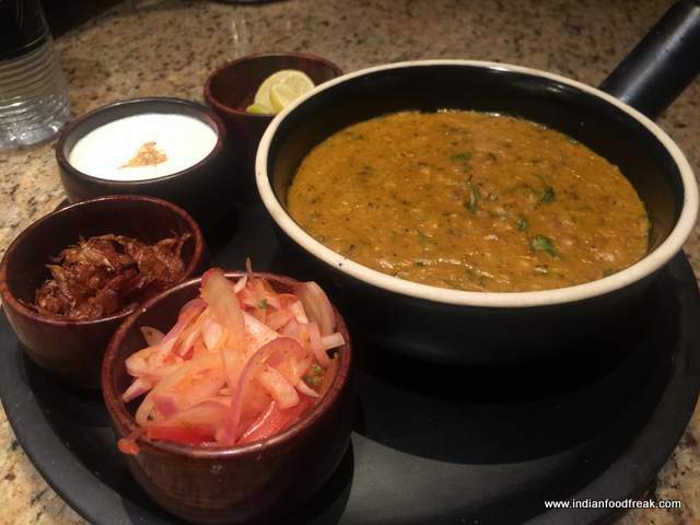 With appetite going on an overdrive at the very thought of Nawabi delicacies, I sat nursing my Saffron flovoured Gin & Tonic (try it – gives a whole new twist to the regular mundane drink) at the “Taste The Tradition” dinner. Rows of pickles and heaps of spices gave me plenty to peep into. Amuse Bouche was brought to the table – Pani Puri with a twist which was rather difficult to get into one’s mouth; I prefer a regular puri which fits into my mouth.