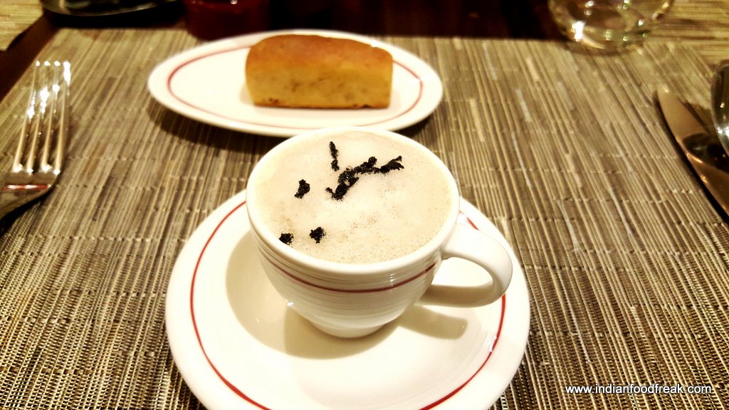 We started with Mushroom Cappuccino soup that came with porcini brioche topped with olive dust. I could smell and taste truffle oil. The tasty soup used porcini, Portobello and button mushrooms. I liked the fact that the froth on the soup lasted really long in spite of the soup being on the side of being a little more hot than the warm temperature in which cappuccino is usually served to maintain the froth.