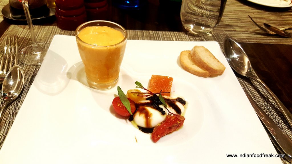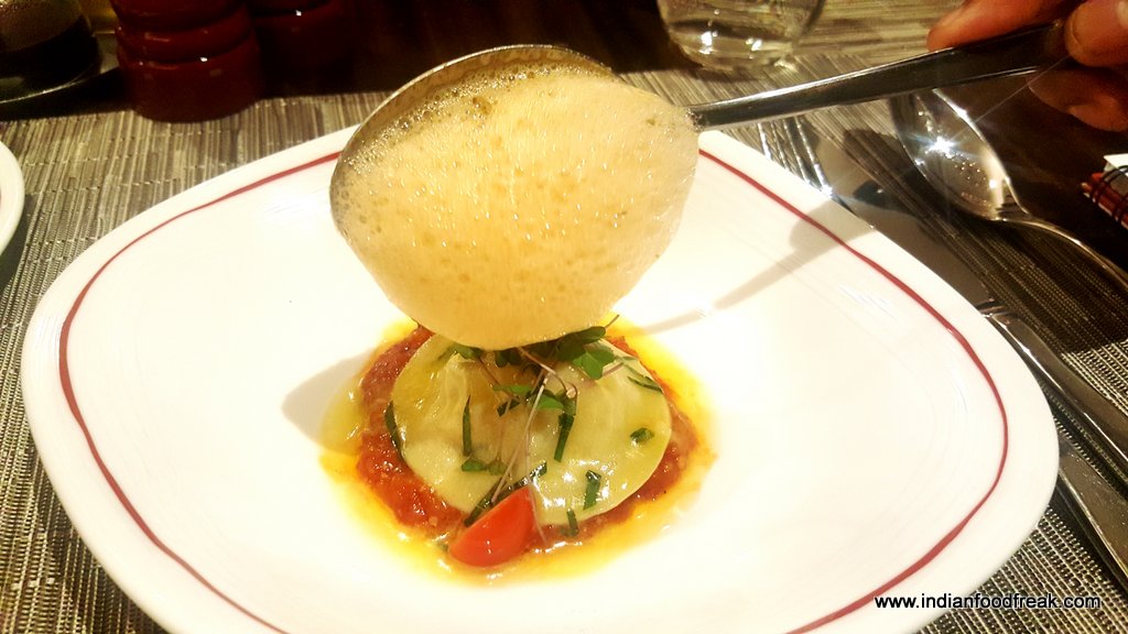 The Bella Cucina version of Caprese Salad came with lot of drama where Sous Chef Amit Kumar gave a molecular twist to the ingredients. While I loved the tomato froth that was served on the side, I missed the bocconcini cheese chewy bite as it was replaced by creamy mozzarella. My wife’s Compressed Beetroot Salad that came with goat cheese snow was just perfect.