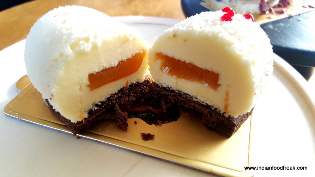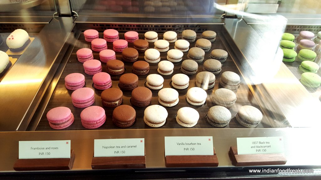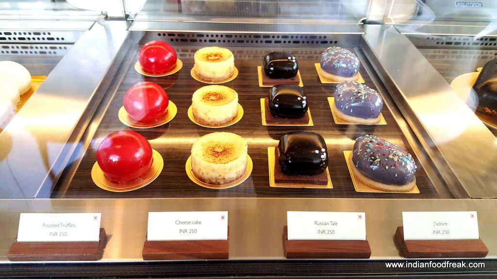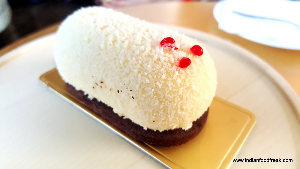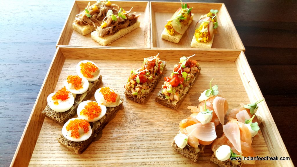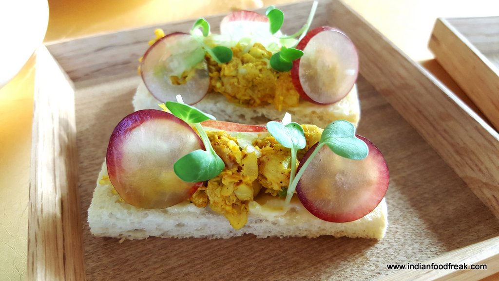 Moving on to the savouries, we sampled finger sized bites from the sandwich section. The stars for me were the Quail egg with grain mustard yolk and tobiko (a popular substitute for caviar) and the Organic egg with grain mustard and parsley.The Confit duck arugula with juniper, House cured salmon with lemon cream and apple scented onion,Goat cheese with roast pepper and walnut and Confit coronation chicken with celery stalks and California grapes were par excellence. The bread is toasted with surgical precision, firm enough to hold the filling and soft enough to chew easily. However, the Chicken and wild mushroom Quiche was dry and lacking in the “gooey” quotient and wasn’t at the same level as the others.