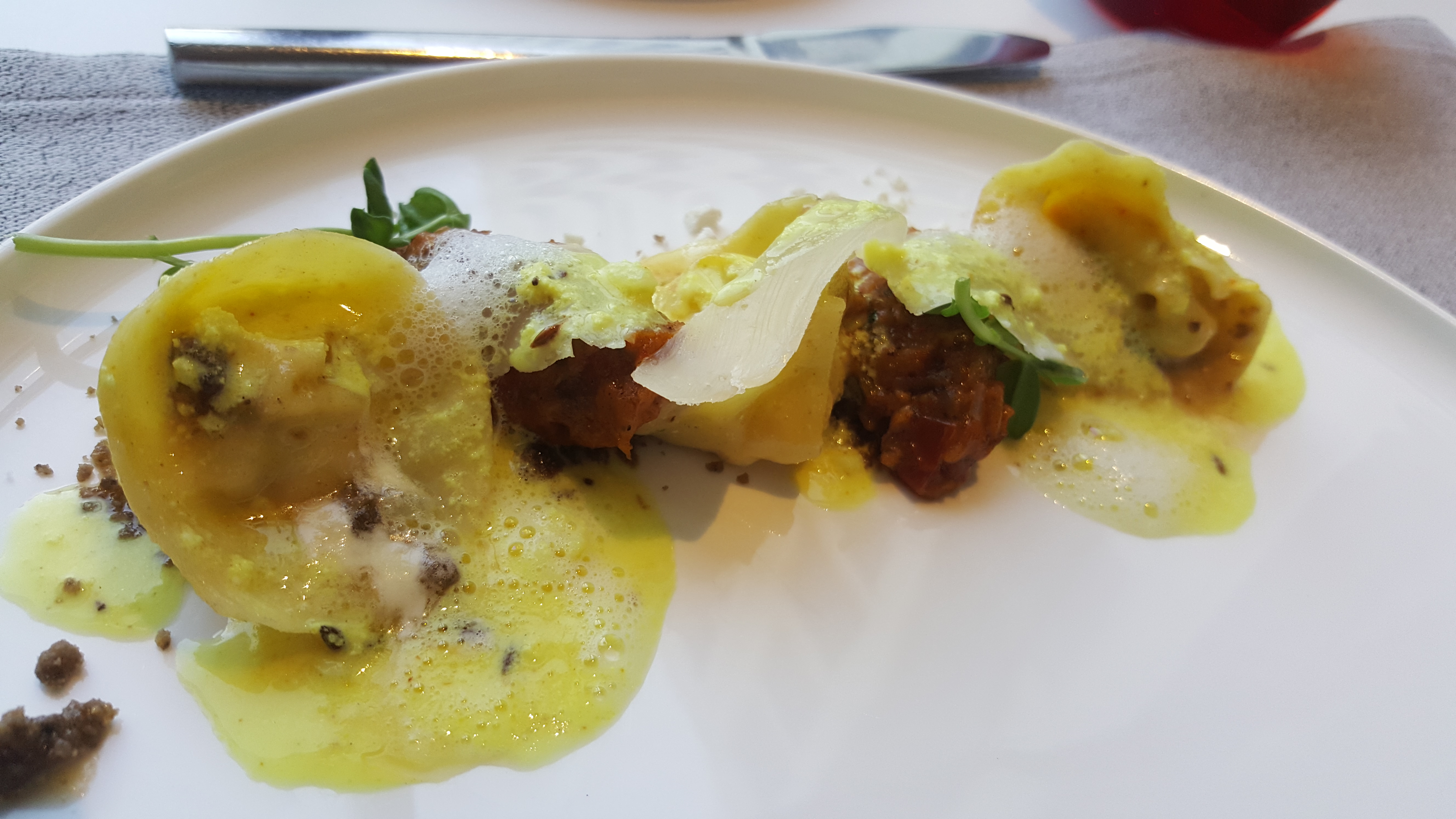 In the entrée we are served Baingan bharta tortellini. This is such a brilliant dish where India meets Italy. The smoked bharta is paired with whipped cheese tortellini filled with ricotta, parmesan and mascarpone. Ginger and cumin tempered yogurt like our Indian Kadi provides the dressing and olive streusel is sprinkled on top. While olive streusel is a new condiment obsession, I am trying it for the first time. I ask the chef and he explains that it is made with almond powder, butter and dehydrated black olive. However if you still want to know more like I did, check this link: https://www.foodandwine.com/recipes/beefsteak-tomato-and-burrata-salad-olive-streusel